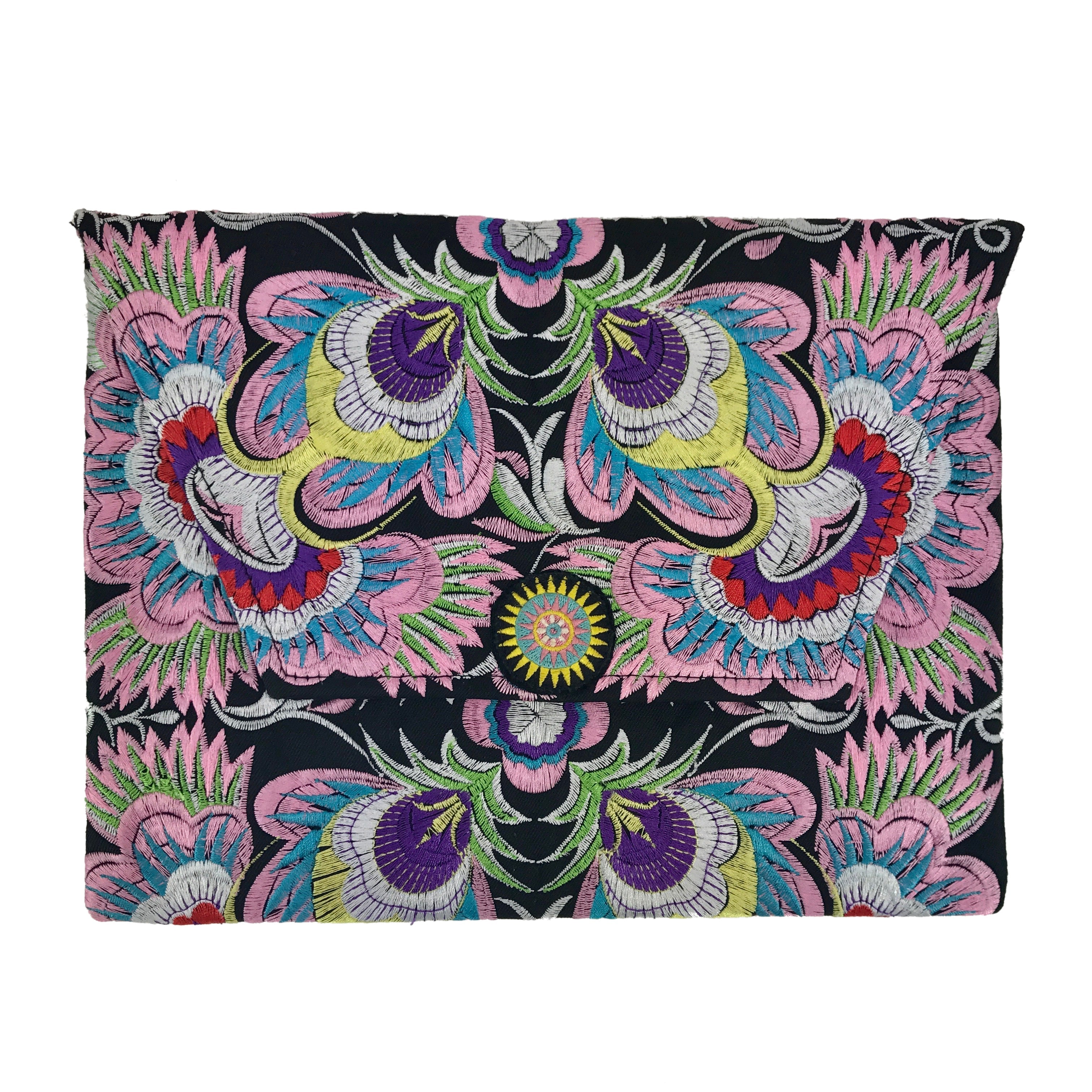 Add a bold statement to any outfit with the Embroidered Flower Clutch. Perfect for the beach, brunch, and everything in between! It is completely embroidered on the front and back by the Hmong Hill Tribes of Northern Thailand. This clutch is a fusion of traditional Thai design with a modern twist.